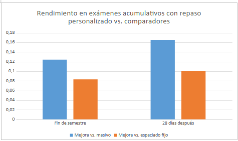 Sobre el aprendizaje espaciado se destaca la mejora del desarrollo de la memoria a largo plazo. Con esta mejora se estima optimizar la adquisición de vocabulario y con ello desarrollar la competencia lingüística.